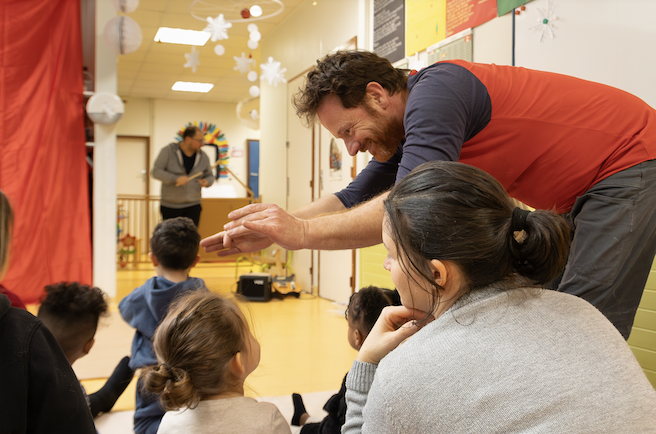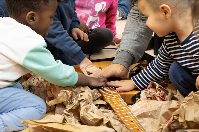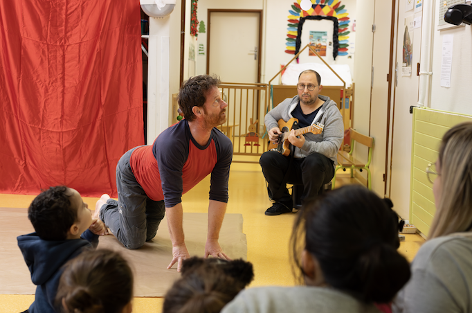 S’adaptant à l’espace des crèches et à leur mobilier, cette proposition fait feu de tout bois, et de tout objet un instrument de musique. Il n’est pas rare que ce moment finisse par un concert collectif autour d’une guitare amplifiée devenant percussion !